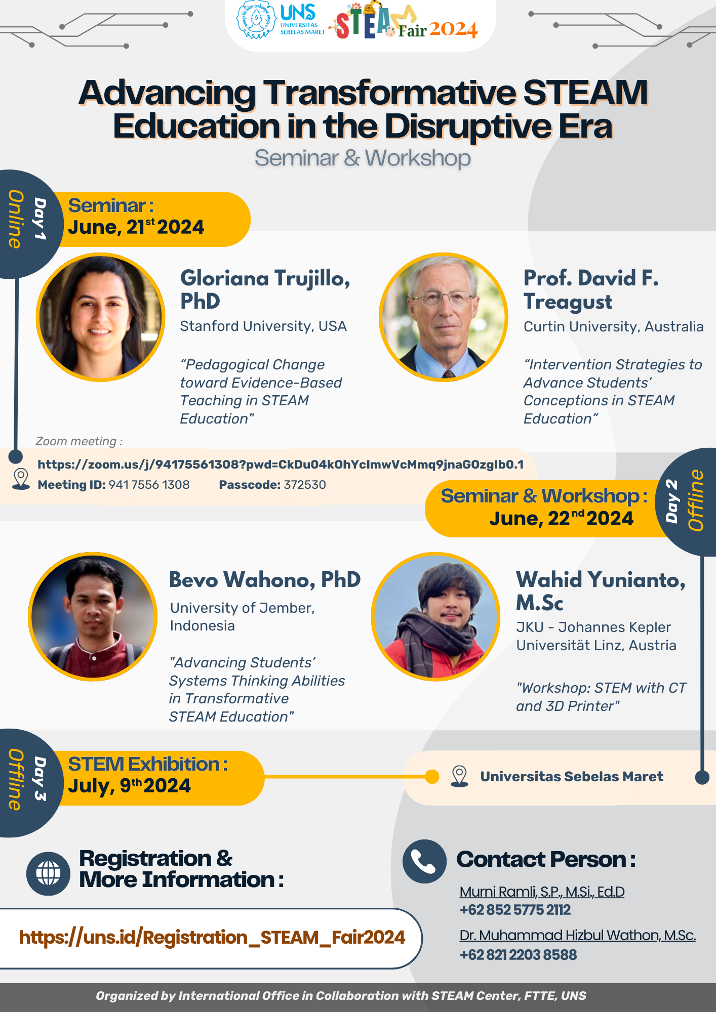 International Office in collaboration with STEAM Center of Faculty of Teacher Training and Education, Universitas Sebelas Maret (UNS) – Indonesia proudly invite you to participate in STEAM Fair UNS 2024: with the theme of “Advancing Transformative STEAM Education in the Disruptive Era”.