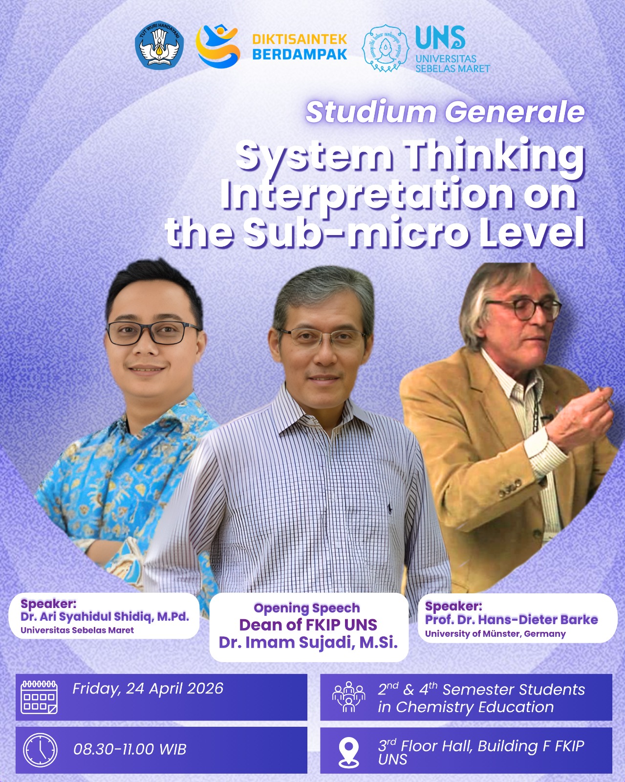 FKIP UNS proudly presents a Chemistry Education Seminar featuring two distinguished speakers: Dr. Ari Syahidul Shidiq, M.Pd. (Universitas Sebelas Maret) and Prof. Dr. Hans-Dieter Barke (University of Münster, Germany). The seminar will be officially opened by the Dean of FKIP UNS, Dr. Imam Sujadi, M.Si.