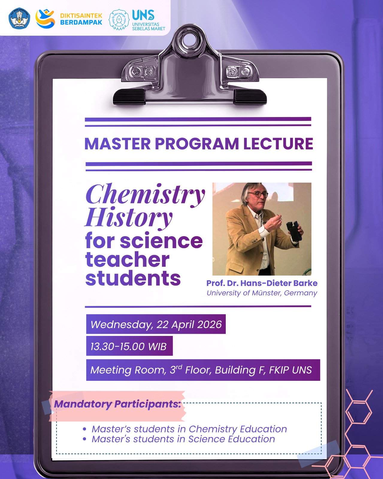 The Master’s programs in Chemistry Education and Science Education at FKIP UNS invite all students to a special lecture titled “Chemistry History for Science Teacher Students” delivered by Prof. Dr. Hans-Dieter Barke (University of Münster, Germany). Prof. Barke will explore why historical context matters for chemistry instruction and how teachers can use historical narratives to clarify difficult concepts.